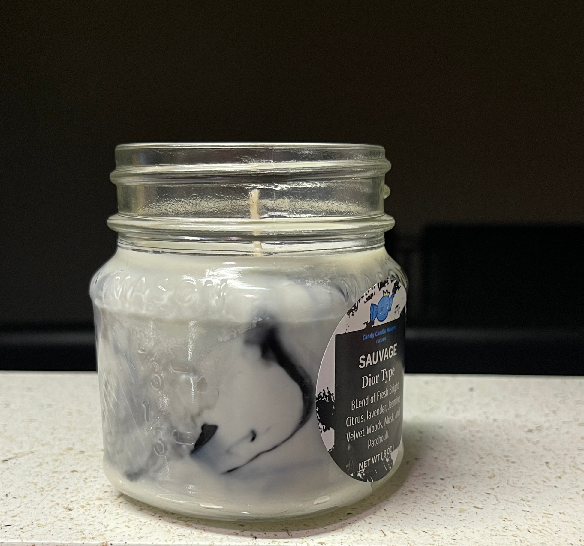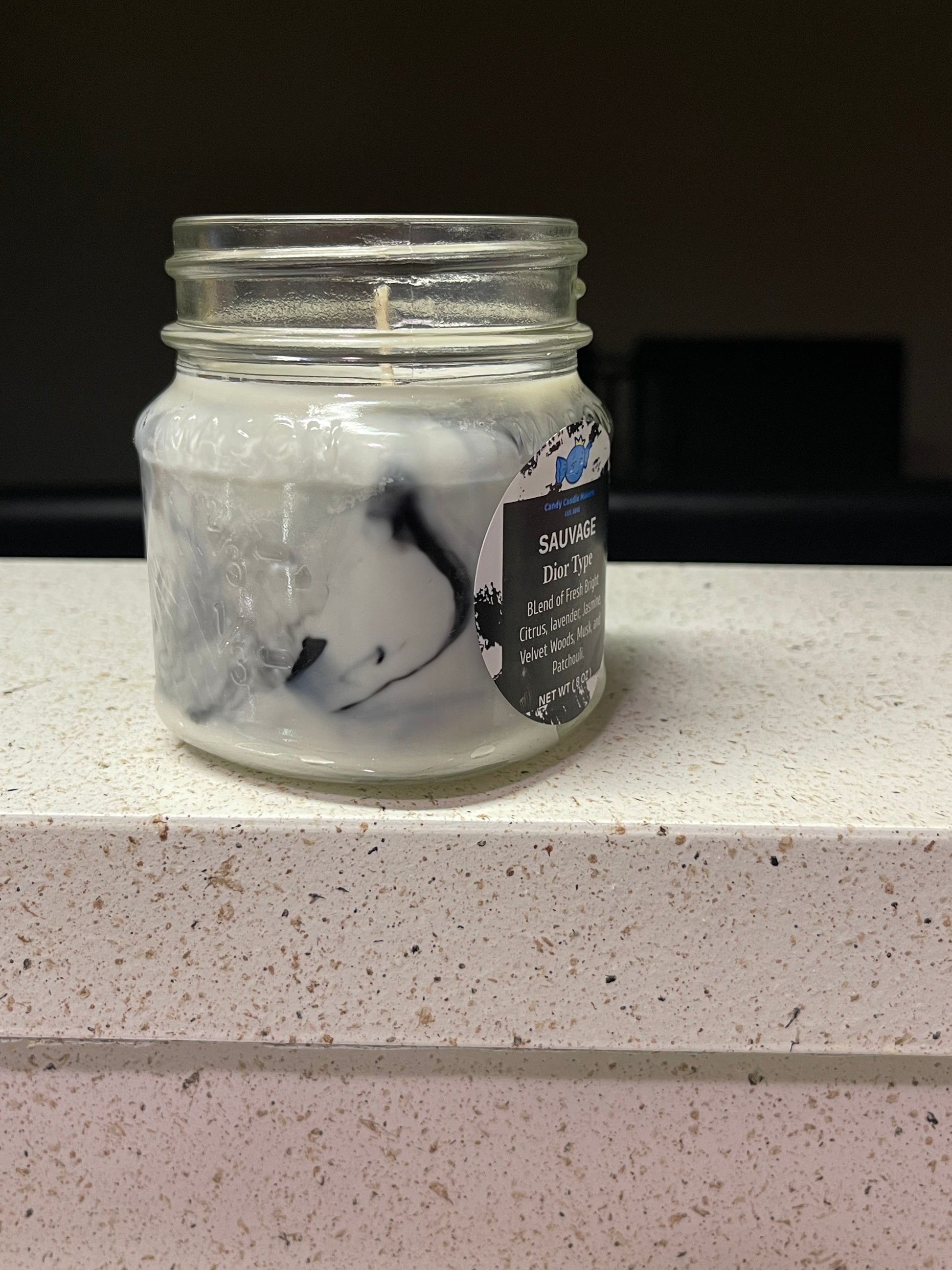 Bring bold sophistication into your space with our Sauvage Dior Type Candle, hand-poured into a timeless 8 oz mason jar. Each candle features a striking black-and-white marble swirl design, making it as visually stunning as it is fragrant.